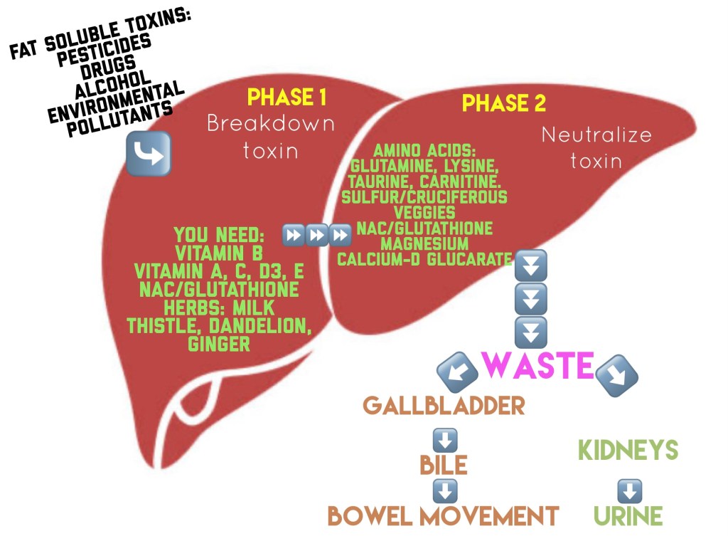 Phase 1 Liver Detox: This phase allows our body to take fat soluble toxins like pesticides, prescriptions drugs, alcohol, environmental pollutants and break them down to be processed.